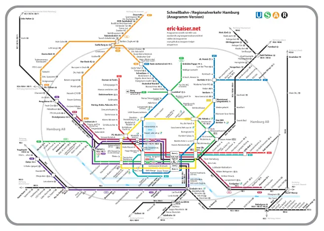 A map of the railway network in Hamburg, Germany, where all station names have been replaced with anagrams of themselves. All anagrams, like the original map, are in German.